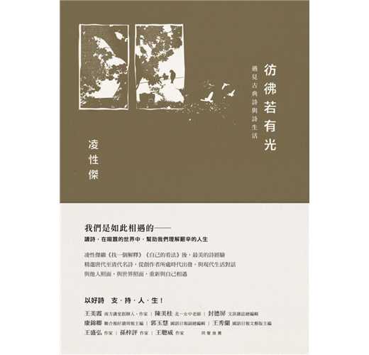 詩人們有的身處亂世,或幸逢極盛一時的豐餘富饒年代,生命際遇的高低起伏,更是每個人都會遭遇的境地。從古典詩中追尋,作家/詩人/也是老師的凌性傑,從讀詩中看見詩人如何為人?如何處事?如何發揚自己的抱負?同時也領略生命有限,但一個人的光與熱可以透過實踐而無盡的道理。詩句穿越百年,洞悉時代,成為見證。在時間洪荒裡,人們以瞬間的詩心觸及永恆,寫下文字;共同點是擁抱生活,將個人自身對永恆的無窮想像,化成一股慰藉的力量,在不同的時代裡,閃耀,支持著多煩憂的人生。