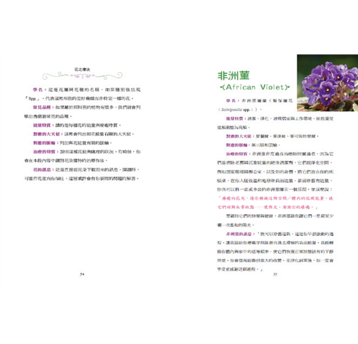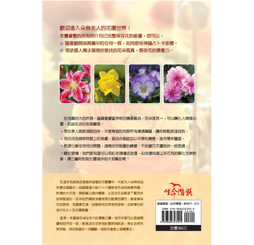 * 全台第一本結合花療法與大天使的大眾讀物,搭配88張全彩的花朵精美寫真,照片均已完整保存花朵能量,經由閱讀,可以輕易汲引等同鮮花特有的療效,全新體驗花療的迷人之處。
