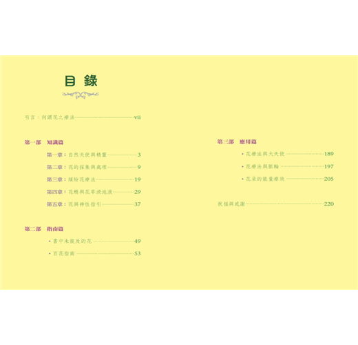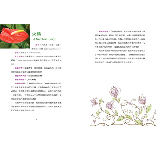 * 生活中各個層面的問題都可在本書找到解答,不同問題有其專屬治療特質的花朵,如何用對花朵的能量很重要,而全部的祕訣都收錄在本書中;書末並整理:花療法與15位大天使、花療法與脈輪、花朵的能量療效等列表,方便快速了解與查閱。