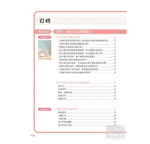 1.帶你從了解小蘇打的清潔原理、使用優點及各種變化法開始,以及如何搭配其他好用的環保素材一同做居家清潔。