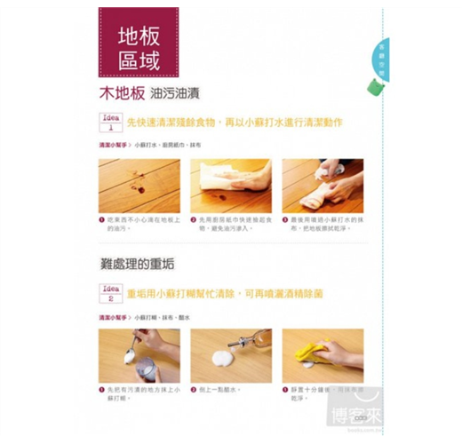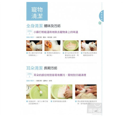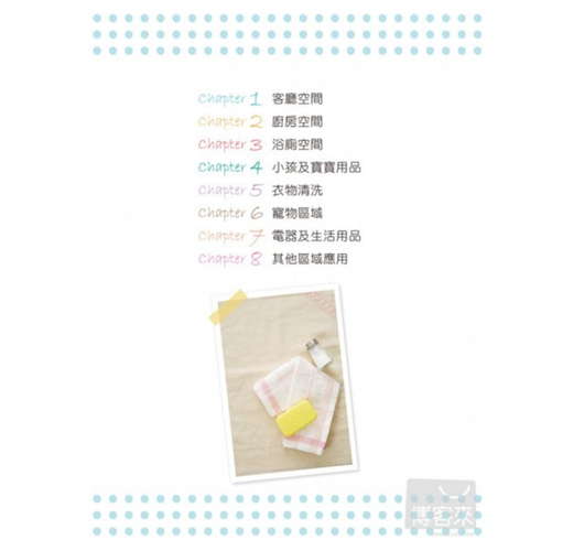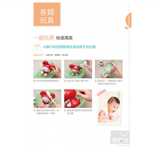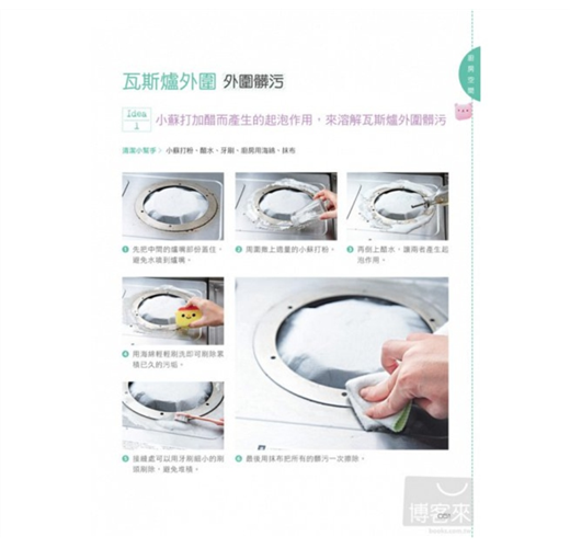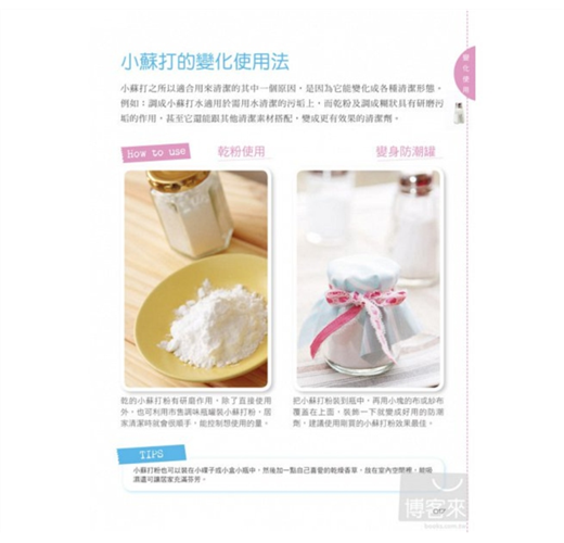 2.有別於日文書的常用的文字敘述及手繪圖,本書清楚明瞭的步驟圖好學習且方便實作,以及使用小蘇打的超效簡易清潔法step by step。