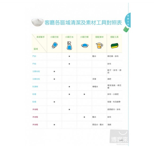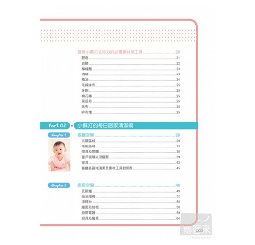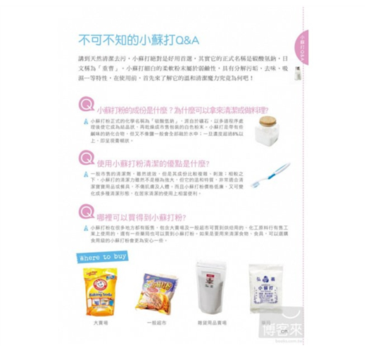 3.特蒐250個小蘇打聰明清潔ideas,從居家清潔到衣物洗滌,以及溫和清洗寶寶用品、寵物區域清潔、呵護肌膚…等;使用範圍橫跨客廳、廚房、浴室三大基礎空間,加上20個類別的生活用品所使用的清潔素材、工具皆完整列表對照,讓居家清潔工作更簡易輕鬆。