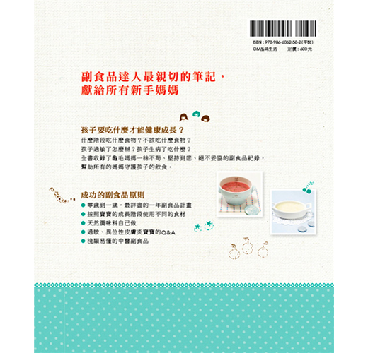 一邊帶孩子、處理家務事,一邊又要準備出書,嚴格說起來談不上是什麼豐功偉業,不過我很感謝身邊幫助過我的人,女兒珠荷在我忙著拍攝照片、寫稿子時,總是一個人在旁乖乖吃飯、安靜地玩耍;還有每次遇到要外出進行拍攝時,都放下手邊事幫我照顧孩子的先生,因為有他們兩人的全力支持,這本書才能順利問世。同時也很感謝出版社給我這個機會,這本書對一個喜好美食、非常平凡的母親來說是一項非常珍貴的禮物;還有幫我拍出一張張美麗照片的攝影師好友之英,妳的專業和友誼我銘記於心。希望每個媽媽都可以煮出最健康的副食品給孩子,同時以身為媽媽感到榮耀。