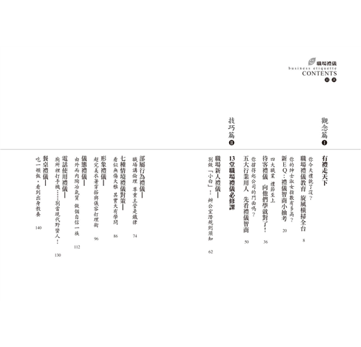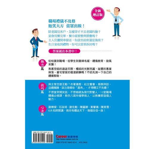 與主管怎麼互動?衣著儀態、社交餐會、商務拜訪、送禮餽贈,該注意哪些『眉角』,才得體又不失禮?不想當眾鬧笑話、不想被視為現代野蠻人,13堂職場禮儀必修課,教你八面玲瓏學做人,以教養塑造個人魅力。