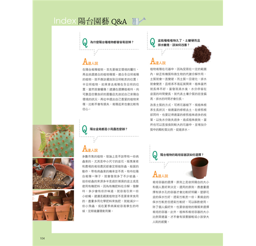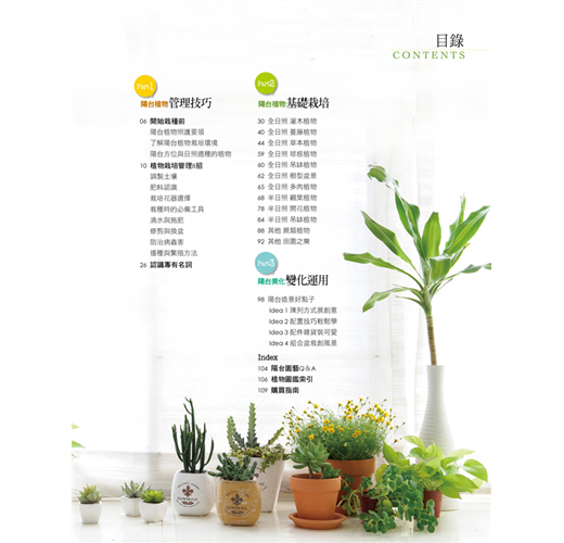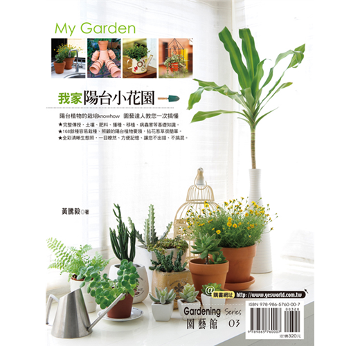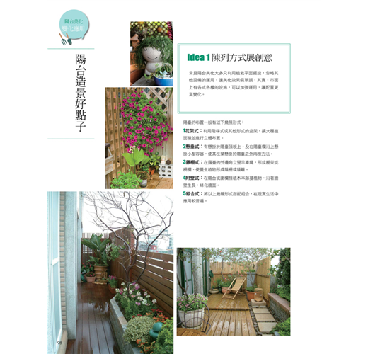 此外,詳附植物寫真,對於陳列方式、配置技巧、組合盆栽等陽台綠美化的運用,及常見疑問的Q&A,是認識植物、實現陽台花園夢的最佳工具書。