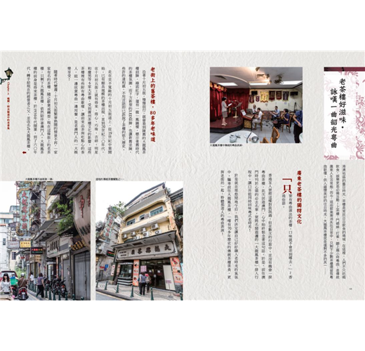 澳門人,一天的飲茶樓時光。進老巷弄,紅磚或者粉牆內,熙來人往的喝茶風氣仍久久不散去,飄散著淡淡的茶香與點心之間,這是澳門式的正統喝茶法則。而有著咖啡、茶點與糕餅的「茶室」,到底賣的是甚麼氣氛?怎麼卻與巷弄間的午後氛圍竟如此契合。流連在老時光裡的咖啡館與茶樓中間,純粹的懷舊風味讓人久久不捨離去。