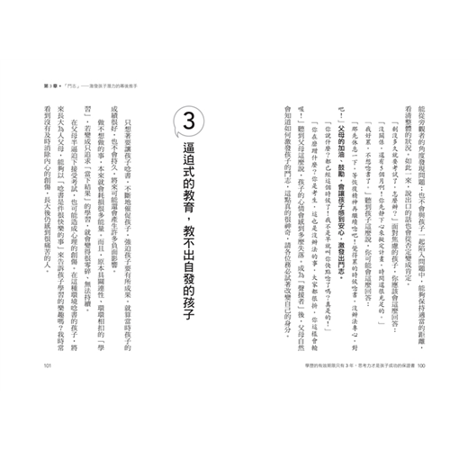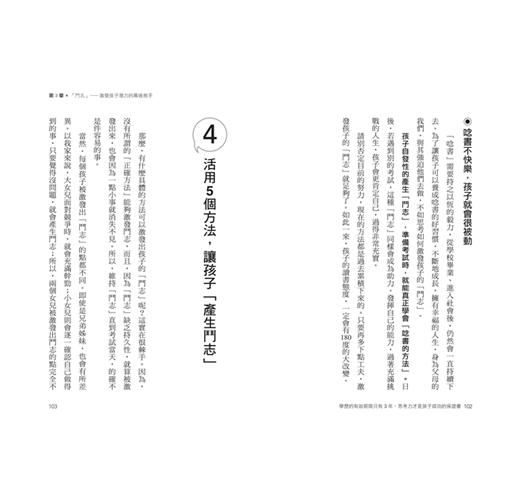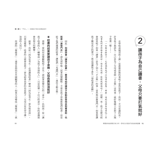 「不要再玩電腦了,趕快進房間唸書!」「明天要交的作業,你不是還沒做完嗎?都快要考試了,你到底在幹嘛?」你是否常常這樣對孩子說,非得要三催四請,孩子才會心不甘、情不願地開始讀書呢?其實,孩子是為自己讀書,並不是為父母;然而,父母一再地強迫,就會讓孩子產生「我是為爸媽而讀書」的心態,自然會變得很被動。所以,作者告訴我們,別總想著「我要讓孩子唸書」,而要思考如何讓孩子自動自發地坐到書桌前,也就是「激發鬥志」。