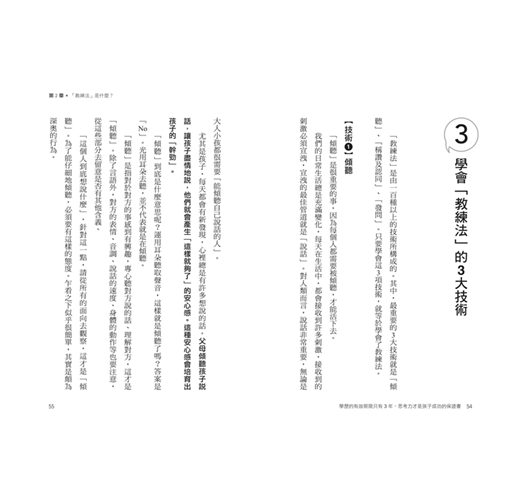 「教練」如果細分起來,是由百個以上的技術所構成。其中,最重要的三大技術就是,「傾聽」、「稱讚及認同」、「發問」。只要學會這三項技術,就等於學會了教練。