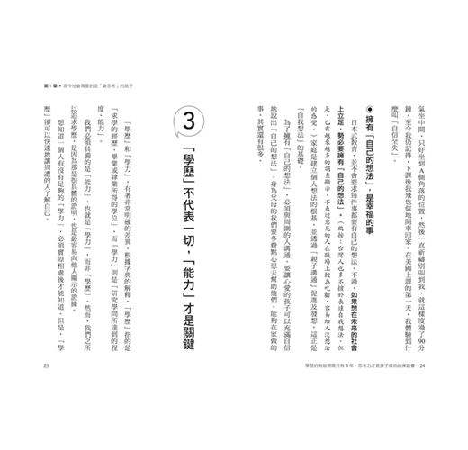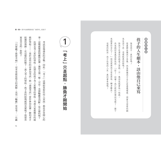 許多父母往往因為太愛孩子、希望他們擁有平順的人生,因而自作主張地為孩子安排一堆「提升競爭力」的課程,強迫孩子考上「好學校」、選擇「好科系」。然而,卻從未問過孩子:「這是你喜歡做的事嗎?」總是強迫孩子按照自己安排的「劇本」過生活,於是,孩子變得懶散、不積極,一旦踏入殘酷的職場,很快就會被淘汰。