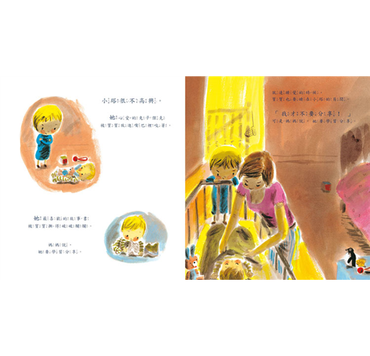 她的兔子傑克沾滿了寶寶的口水,她最心愛的書被寶寶撕得破破爛爛,就連睡覺的時候,寶寶也要睡在小塔的房間裡。媽媽說:「你要學習分享。」小塔百般不願意!
