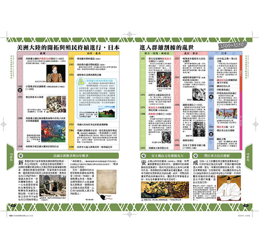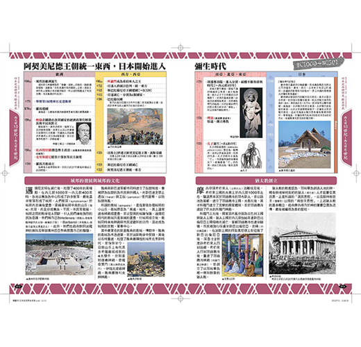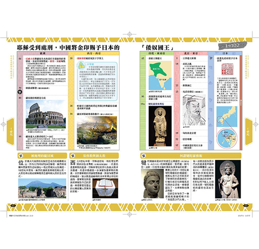 以地域為區別的圖表搭配詳細解說,帶您瀏覽人類從石器時代到歐巴馬當選總統的7000年完整文明史!各國、各大洲重要事件相互對照,瞬間釐清事件脈絡,從人類創造器物、改良制度,各大國之間的征伐發展與交流,都能在「橫向編年體圖表」的便捷編排下快速瞭解,各專欄解說更讓您對重要人、事、物有更深一層的認識。