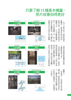 ◎提供15種構圖基本原則,如二分法、對稱、九宮格、三角、傾斜等等
