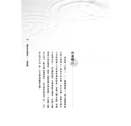 陳幸蕙。O型獅子座,素食主義者,自由的文學人。人生觀是「忠於自我,熱愛工作,享受生活,持續成長,歡喜創造」。臺大中文研究所碩士,曾任教職,並擔任臺北商業技術學院駐校作家等,現專業寫作。曾獲中山文藝獎、中國時報文學獎、梁實秋文學獎等,當選十大傑出女青年,作品選入國小、國中、高職、大學國文課本。著有《把愛還諸天地》、《悅讀余光中》(詩卷.散文卷.遊記文學卷)、《與玉山有約》、《玫瑰密碼──陳幸蕙的微散文》,並編撰《小詩森林》、《小詩星河》、《余光中幽默詩選》等數十種。