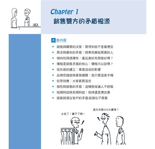 本書不僅對銷售中的心理現象給予科學解釋,還搭配豐富的案例和幽默的漫畫,以漫畫與文字結合的方式具體生動地向大家介紹銷售活動中的現象,在娛樂及輕鬆的氛圍下獲得啟示。本書提供的「銷售指導」通俗易懂又具有實務性質,相信會給大家實際的幫助。