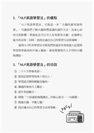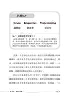 NLP是讓一般人能理解、開發並使用自己大腦潛能的學問。想要開發大腦潛能,最主要的功課在於:「理解自己、並為自己植入正向和積極的大腦程式」,本書中列出以「五感」(視、聽、觸、味、嗅)作為分類的多種NLP學習法,讓讀者們能試著從這些方法中找到適合自己的學習方式、獲得最有效的英語學習效果。