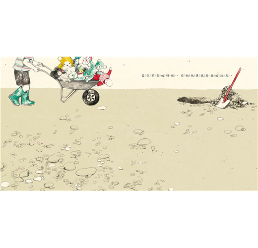 當小男孩說:「當你不在的時候,我不用跟人分享。」這時他獨自坐在大蛋糕前,鼻子沾上了蛋糕上的蜂蜜。一個人吃蛋糕,應該可以吃得很狂野吧,畢竟沒有別的人要吃,直接大口一咬也無所謂吧,但是小男孩只規規矩矩的切了一片蛋糕,看著螞蟻大隊聞香而來,一點一點的搬走蛋糕。原本應該跟姐姐分享的蛋糕,現在分給螞蟻吃了,小男孩卻一點也不覺得可惜。或許沒有姊姊在身邊,再好吃的蛋糕,一個人也是吃不下的。