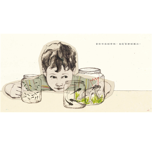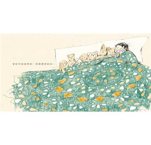 瑪麗亞賀塔的文字簡單深刻,往往只有短短一行,卻蘊含豐沛情感,可以與讀者的生活經驗相互連結。當故事中的小男孩說:「當你不在的時候,房間變得好大。」讀者心裡立刻想起自己伸長手腳,大字形的躺在原本應該和兄弟姐妹共用的大床上,但是把眼光回到插圖,卻發現小男孩獨自一人睡在床上,應當可以放肆的伸...