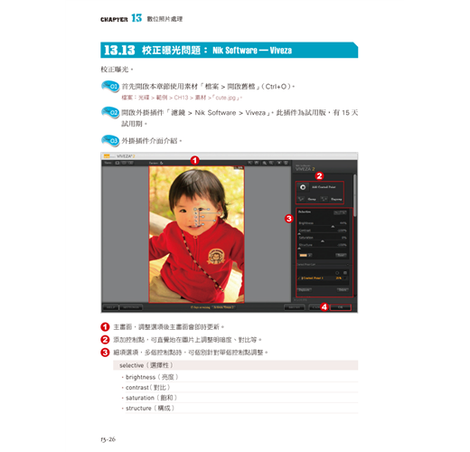 而最後附錄還額外整理了Photoshop CS6的新增功能,同時也介紹許多數位影像後製的技術觀念與知識當中的動作參數與功能介紹,讓讀者在日後所需,只要翻開附錄即可找到所需的功能講解。