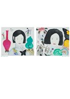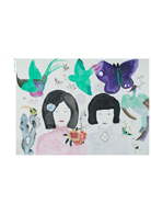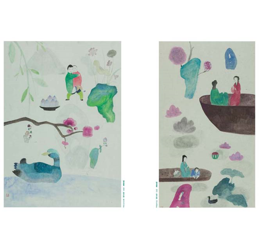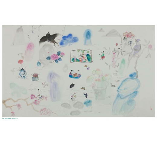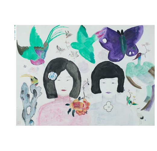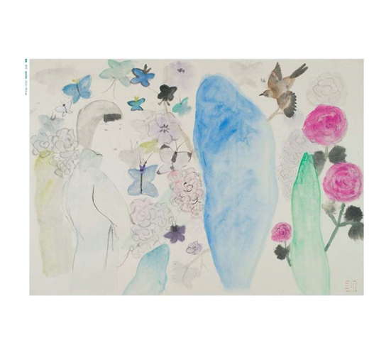 在她的畫中,花、人、物散落著,留白頗具風韻,整個讀來卻猶如娓娓道來般展開,氤氳的色彩模糊了觀者的視線,需要如“霧裡看花”般找尋圖像中的故事。她用色明亮,濕潤的筆法柔和了明麗帶來的尖銳,王濛莎的畫中人帶有一種古風式的審美,纖細的眉眼,狀似垂眉順眼般乖巧,鵝蛋臉,著寬袍,妝容髮髻有著對中國古典的崇敬之意,被刻意縮小的人物匿於角落,行私密之事,放肆恣意,花卻膨脹,成了圖像的主體,掩不住滿園春色。──《Hi藝術雜誌》