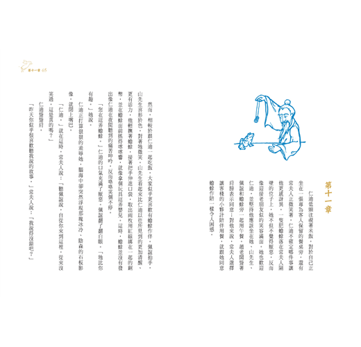 藉著常夫人的用心「點化」,仁迪逐漸敞開自己的胸懷,講述自己的故事,但依然無法完全放下。一直到慘遭綁架、眾人設法救了他後,才承認自己是虎縣令的兒子,他所說的故事裡的男孩就是他。眾人都以寬容的態度接納了他,尤其一向跟他唱反調的客棧女兒佩誼更把他當親人看待。兩位仙人常夫人與山先生在故事中扮演的就是智慧老人,只是常夫人一舉一動都收放自如,是外顯性的,而山先生的言談動作卻是深藏不露、隱隱約約,是內隱性的,需要一再思索。兩位智慧老人的對比成為故事的另一種趣味。