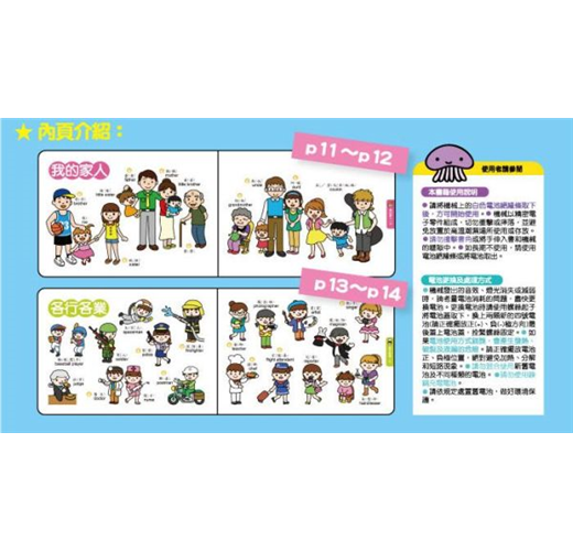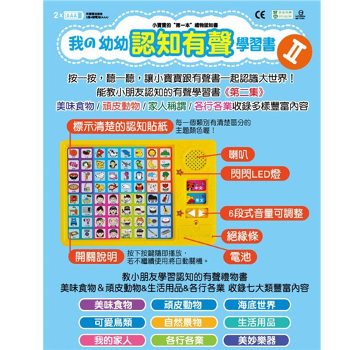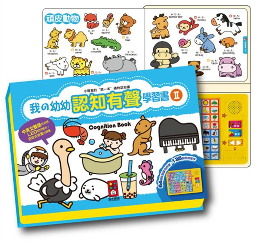 小手按一按,聽聽看這些美味食物、頑皮動物、生活用品、各行各業的名稱怎麼說呢?還有生動有趣的音效,讓寶寶互動學習更好玩喔!