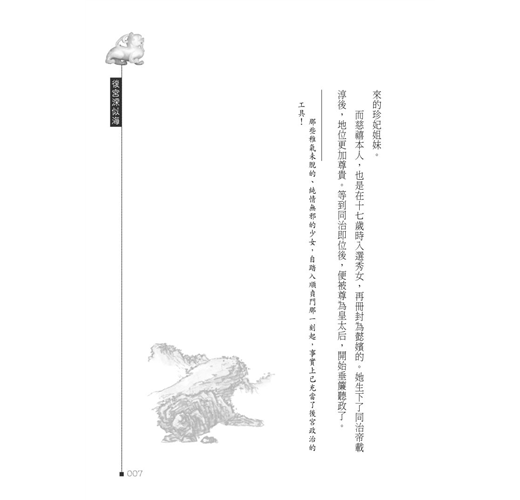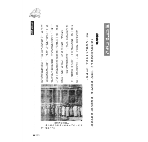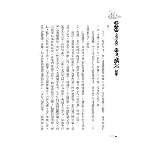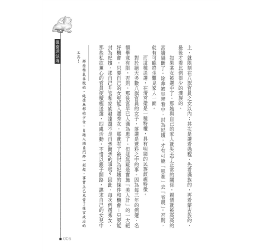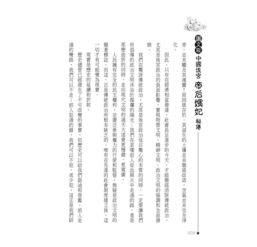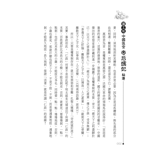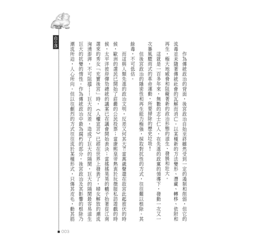 帝后嬪妃、後宮政治,雖受到當時時空背景的遏制,以及對抗勢力的削弱,但其繆毒却從未雲消霧散,更以其他方式,潛藏轉移、變形依附、滋長茁壯。本書以生動寫實手法,剖析潺述其糟粕利蔽,刊落華辭、刻畫入微。