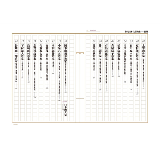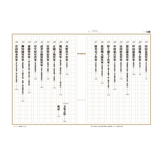 收錄現代怪談文學鼻祖小泉八雲、俳句大家正岡子規、少女小說女王吉屋信子,以及《銀河鐵道之夜》作者宮澤賢智、《舞姬》作者森鷗外、《風林火山》作者井上靖等36位日本明治、大正、昭和時代影響日本文壇與社會文化的重量級作家。細述他們出生成長、生活起居、孕育靈感的家故事,他們的書房、創作的道具、手稿文本、對於空間氛圍的追求……更公開他們居所的空間格局與平面圖,珍貴畫面、風流趣事,史無前例大公開。