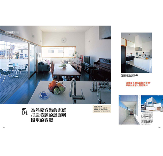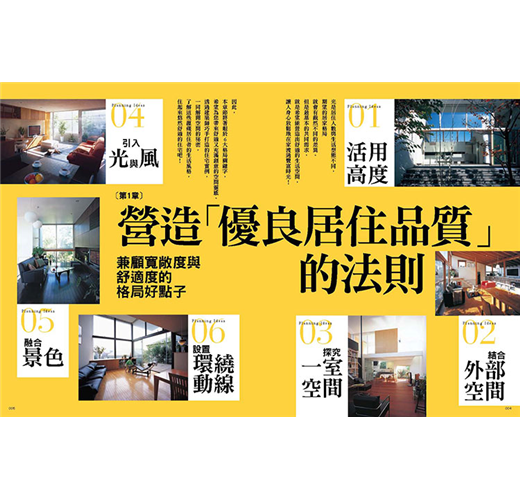 本章特別採訪六間完全不同風格的住宅,有融合安穩與活潑氛圍的小夫妻都市型住宅、兼具美麗迴廊與凝聚喜愛音樂的客廳,或是住起來乾脆俐落的房子、悠遊自在的居家空間,以及專為大家庭打造、所有動線都是「可使用的空間」,最後則是要為大家介紹克服各種困難、實現融入美景的舒適生活動線。