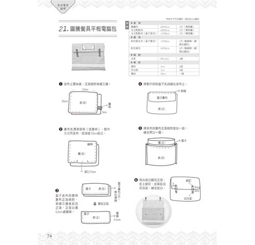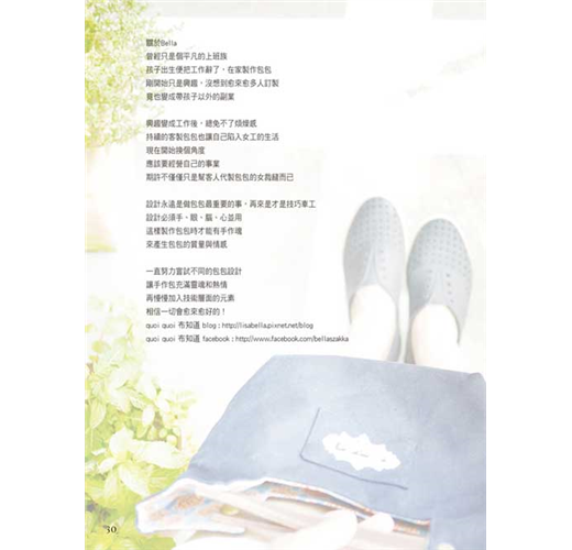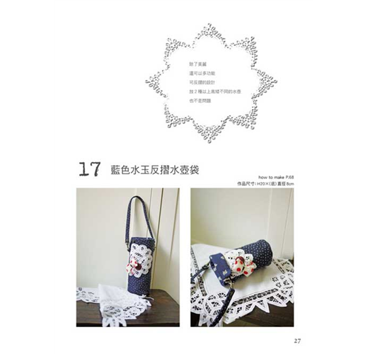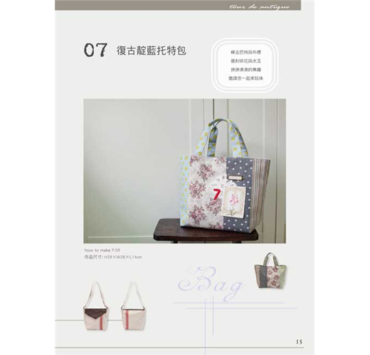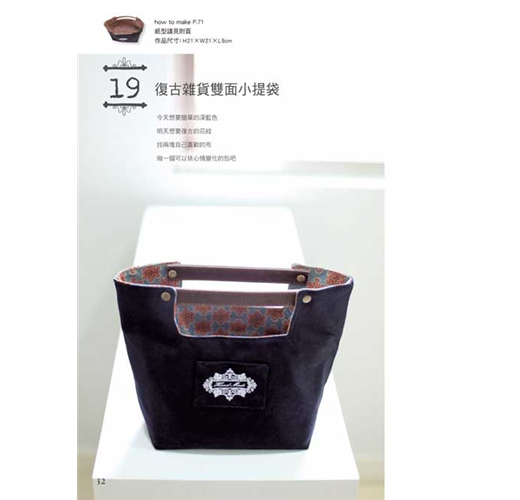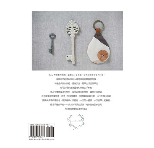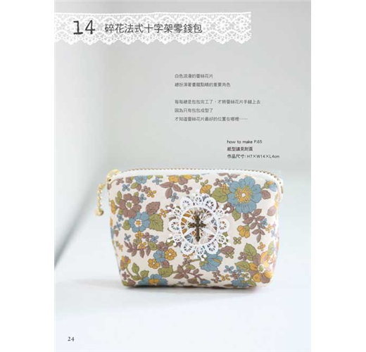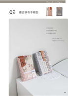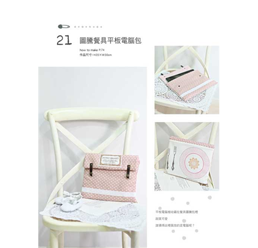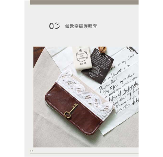 本書分成復刻旅行.蕾絲天堂.簡單生活三個單元,您可以看到充滿靈魂和熱情的手作包。作品有懷舊皮革托特包.皮革古董布侧揹包.蕾絲花朵提袋.百代麗蕾絲拉鏈提袋.法式十字架零錢包.皮革蕾絲古銅手飾.水玉反摺水壺袋.圖騰餐具.平板電腦包.雜貨格紋小手提包.水玉防水提袋.水玉皮革大托特包.簡易手縫皮革包….共25款不同的設計,每款皆有製作說明,希望能啟發您的創作潛力。