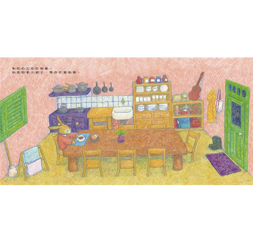 每個家庭都有它的家庭歷史。兔子一家的家庭歷史以廚房那張由兔子老爺爺親手釘造的大桌子為中心:小兔子圍繞著它吃飯、遊戲、做功課,還在大桌桌底塗鴉……孩子成長後分散各地,但代表家庭歷史的大桌子仍然牽繫著大家,也成了大家活得更好的動力……