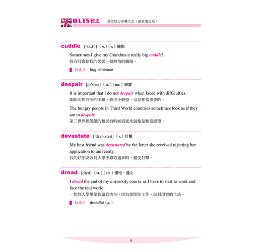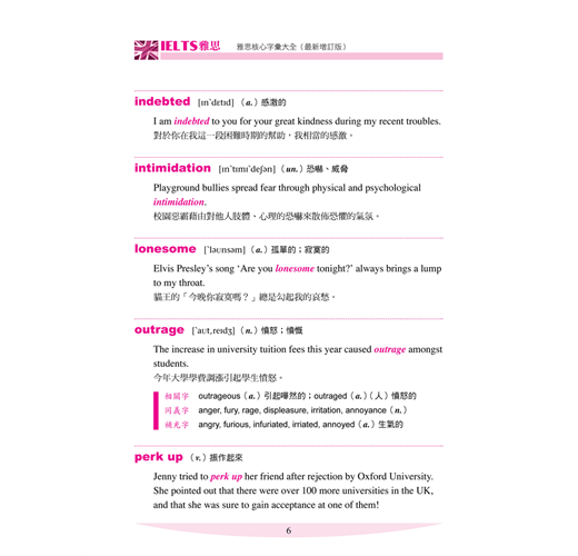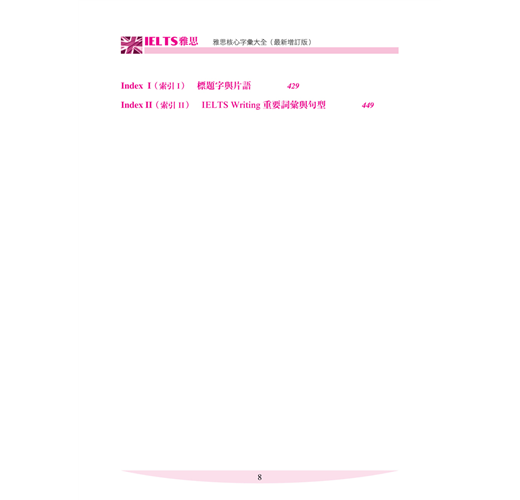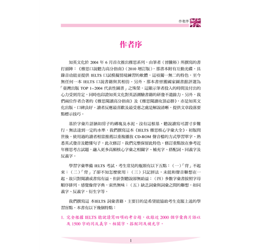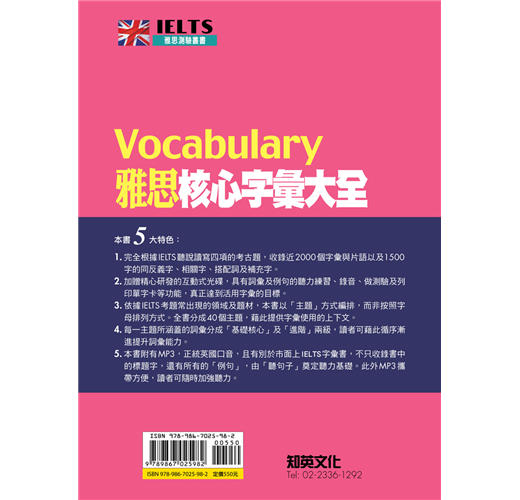 完全根據IELTS聽說讀寫四項的考古題,收錄近2000個字彙與片語以及1500字的同反義字、相關字、搭配詞及補充字。