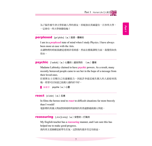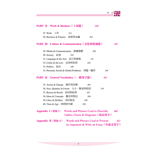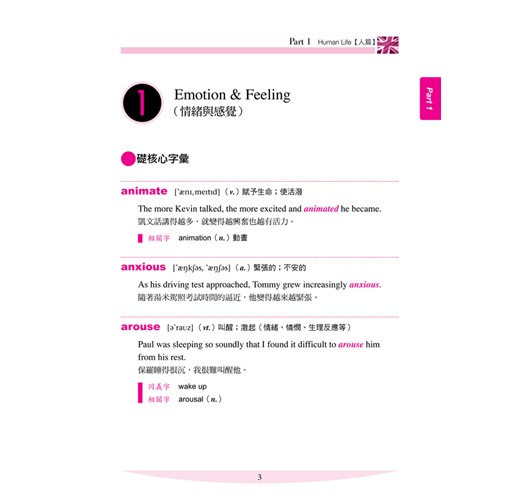 每一主題所涵蓋的詞彙分成「基礎核心」及「進階」兩級,讀者可藉此循序漸進提升詞彙能力。