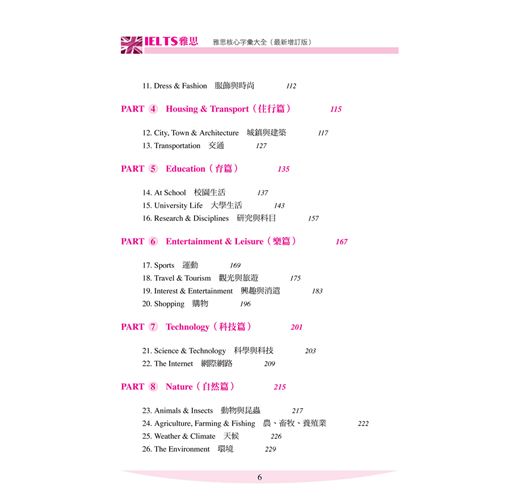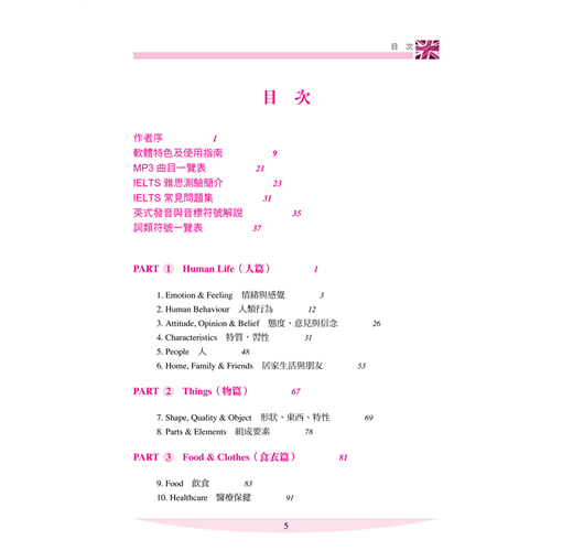 依據IELTS考題常出現的領域及題材,本書以「主題」方式編排,而非按照字母排列方式。全書分成40個主題,藉此提供字彙使用的上下文。