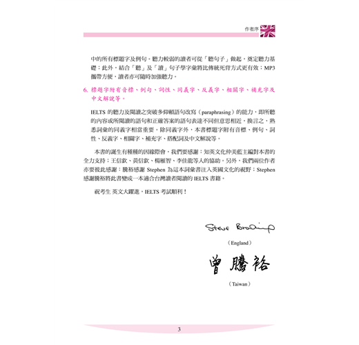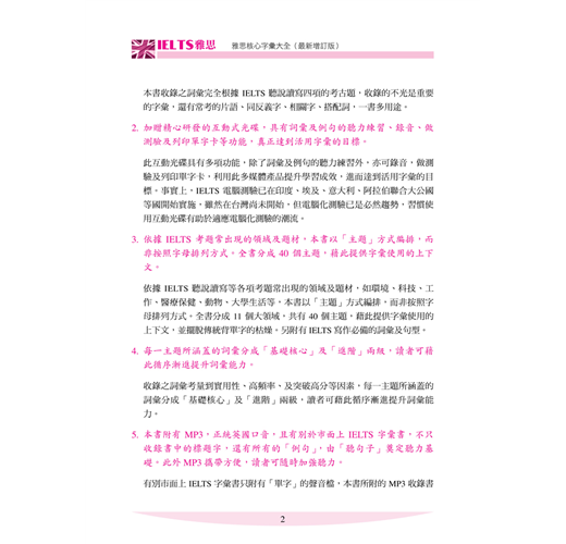 本書附有MP3,正統英國口音,且有別於市面上IELTS字彙書,不只收錄書中的標題字,還有所有的「例句」,由「聽句子」奠定聽力基礎。此外MP3攜帶方便,讀者可隨時加強聽力。
