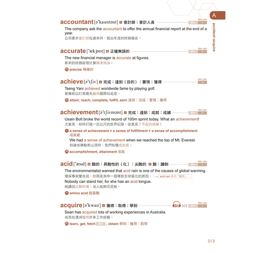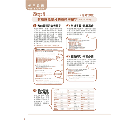 將近十年學測、指考、全民英檢中級考題交叉比對,並根據電腦精算分析,挑選出現頻率最高的英文單字。各單字皆標示出該字於學測與指考出現的次數,次數越高表示越重要,若有標示「英中」,則表示此字也是全民英檢中級的常考單字。本書更邀請外籍老師錄製單字的正確發音,隨書附贈MP3,方便學生利用通勤時間加強英文聽力。