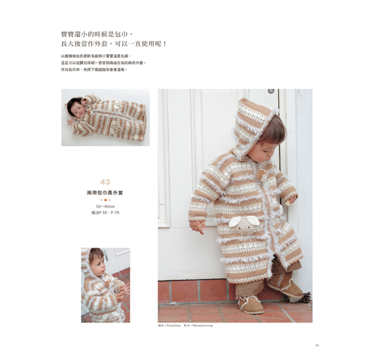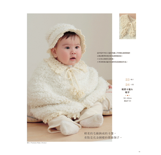 孕育新生命是件美好的過程,在充滿期待的日子裡,不妨拿起鉤針為寶貝親手織一件衣服吧!書中收錄了43件嬰幼兒衣物的詳細作法與織圖,除了初生嬰兒適用的衣物、蓋毯、圍兜兜、小布鞋,以及成長後適用的披風、斗篷、夾克、外套等,還有方便媽媽外出使用的收納袋,以及加入鈴鐺的針織小玩具,軟綿綿的質地十分適合寶寶玩耍。
