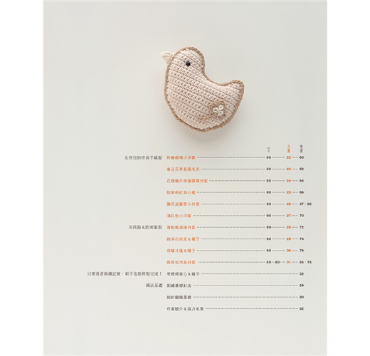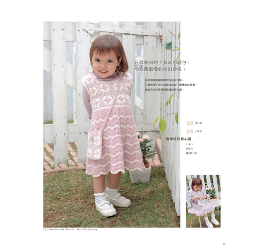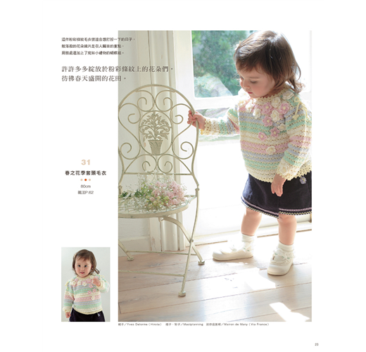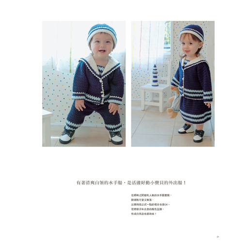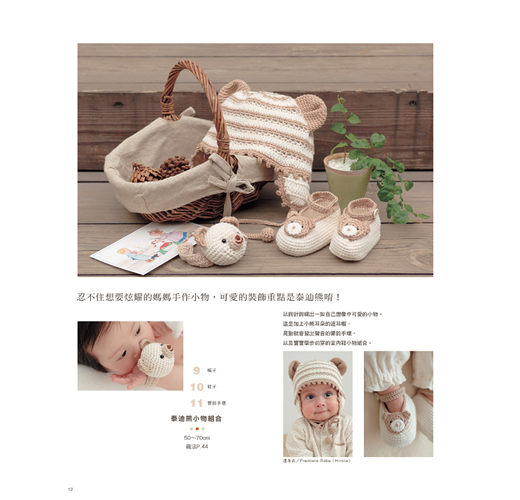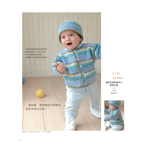 依照季節使用柔軟舒適的棉線或溫暖的毛線,編織帥氣的男孩款式/甜美的女孩款,再加上粉嫩色調,讓小寶貝穿上媽咪親手鉤織的幸福娃娃衣吧!