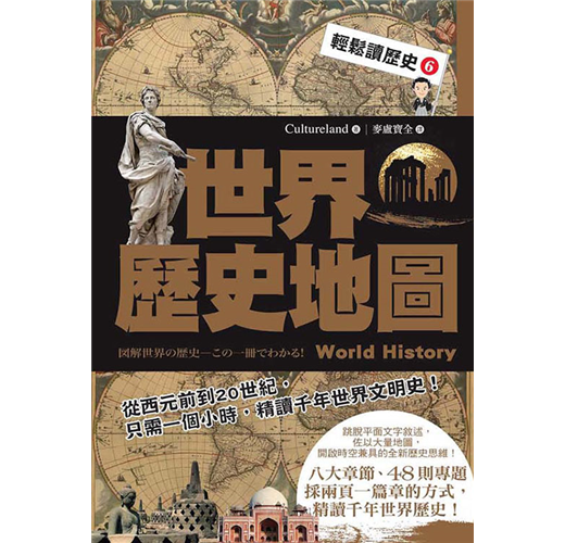 《輕鬆讀歷史6 世界歷史地圖》逆轉歷史書籍的文字劣勢,輔以大量地圖概況,明確指出文明的發展方位和疆界的變遷過程,從西元前到20世紀,文明的激烈交戰情勢經過圖像化,能清楚由地圖讀出國家是如何跨步及退讓,文化是如何傳遞與融合的歷史大勢。跳脫平面的文字概念,由時間到空間,開啓全新的歷史思維!