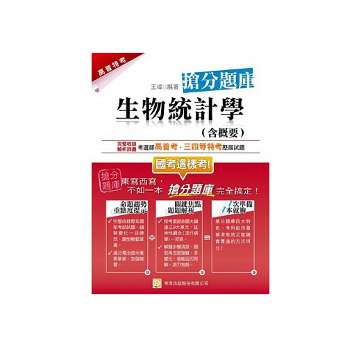 本書不需要你記太多繁複的公式推導證明,亦不需要太多的定理,即可藉由簡單的解釋與考題範例,輕鬆地應付生物統計學試題。此外,亦請搭配考用出版之《觀念式 生物統計學(含概要)》一書,藉上榜關鍵的呈現方式與搶分題庫融會貫通,提升自我戰鬥能力,一戰而勝!