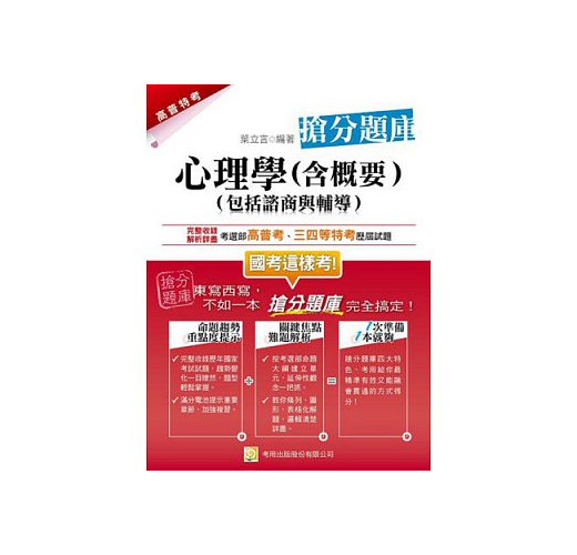 為協助考生在這門科目取得高分,內容按類別分2大篇,共19個單元,解題力求清楚、詳盡,技巧力求易懂、適切。建議搭配考用出版之《圖表式 心理學(包括諮商與輔導)(含概要)》一書,藉上榜關鍵的呈現方式與搶分題庫融會貫通,提升自我戰鬥能力,一戰而勝!