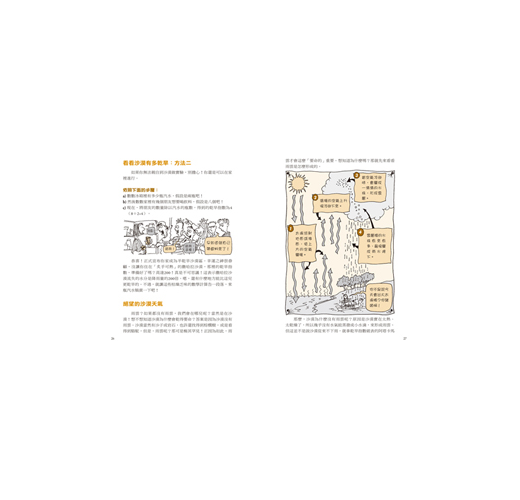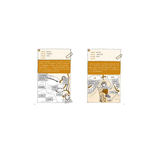 本書一共有九個章節,每個章節都利用插畫圖解方式,分析各項情境,請容我再次強調,這是本書很大的特點。但除此之外,多方面角度的審視,也是學習地理非常重要的環節。整本書清楚介紹沙漠中的各種地形景觀及其成因;還有像沙漠中主要的動物─駱駝,和其他小動物的生活環境;以及如何在沙漠中耕作,種植農作物;沙漠民族日常生活的介紹,甚至對於沙漠的未來,在氣候變遷的影響之下,可能何去何從的討論,多視角的做了一次完整、清晰的介紹。相信小讀者可以從《變幻莫測的沙漠》中,獲得許多沙漠的概念。最後還有小測驗,讓小讀者測試看看,是不是真的理解這些事件想要傳達的觀念。