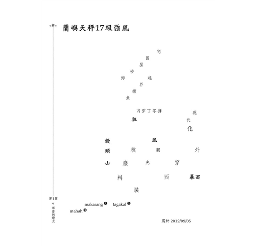 短詩〈山裡〉,是驚夢似的閃電。〈給1982 年出生的札瓦爾的禮物〉猶如海浪上湧動的音樂。〈蘭嶼天秤17 級強風〉是即時新聞的激情圖像。詩集中第三篇「用笛娜的話寫詩」,猶如與現實世界搏鬥的各種夢想。閱讀沙力浪的詩,他讓我有這樣深刻的感受:他的詩句不是用來取悅我們,而是要來感動我們的。