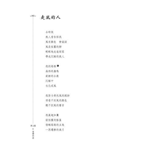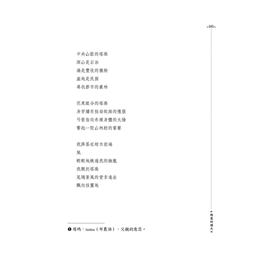 我以為我很會說話,但是一張開口,才發現說的全是別人的話。於是,我重拾笛娜的話,用媽媽的話寫出一首又一首的詩,我要用最簡單的語言尋回自己,尋回那被世人遺忘的,我的族群的,聲音。