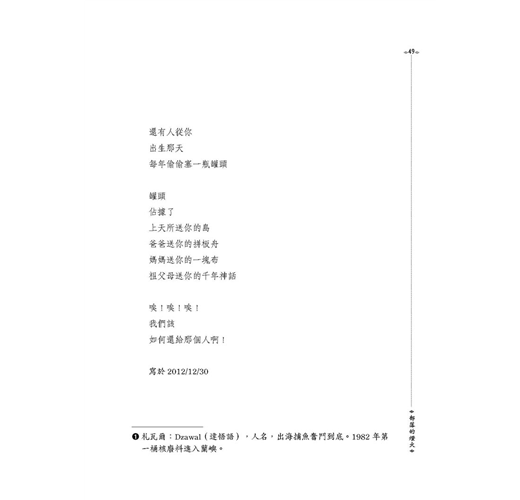 我以為我很會說話,但是一張開口,才發現說的全是別人的話。於是,我重拾笛娜的話,用媽媽的話寫出一首又一首的詩,我要用最簡單的語言尋回自己,尋回那被世人遺忘的,我的族群的,聲音。──後記