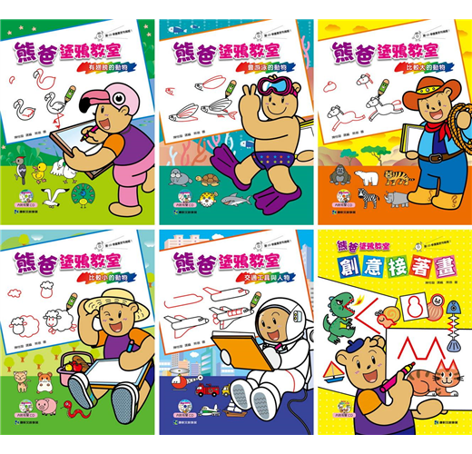 《熊爸塗鴉教室》套書一共六冊,是熊爸專為幼兒設計的塗鴉課程,只要透過簡單的線條,就能組合出千變萬化的形體與外貌,快跟著熊爸一起進入繪畫的世界吧!