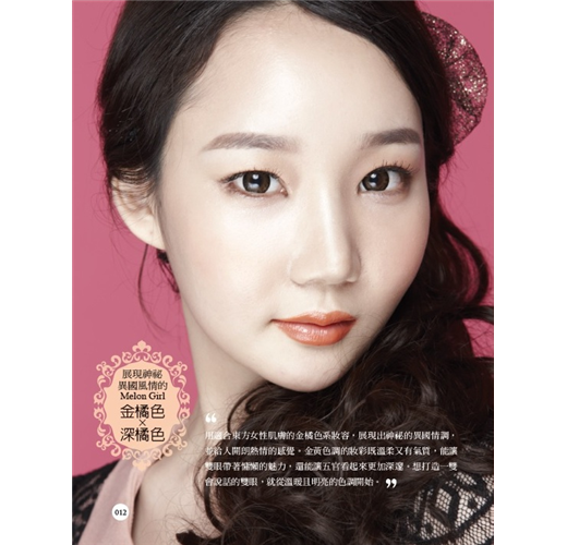 「我的妝容是否退流行了」、「我用的顏色好像很奇怪?」,現在開始將這些煩惱都拋諸腦後,最重要的是對自己五官的了解,並掌握當時的氛圍及場合,配合適當的服裝及髮型,才能對整體妝容有加乘的效果。比起一味的追求流行,還是只有選擇適合自己的妝容,才能突顯自身的優勢。期望透過本書介紹的最新搭色妝,能讓各位讀者對於如何找到適合自己的妝容有更深的認識,並透過這些方法,讓自己的美麗與魅力更發揚光大。