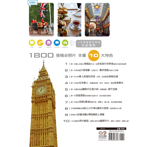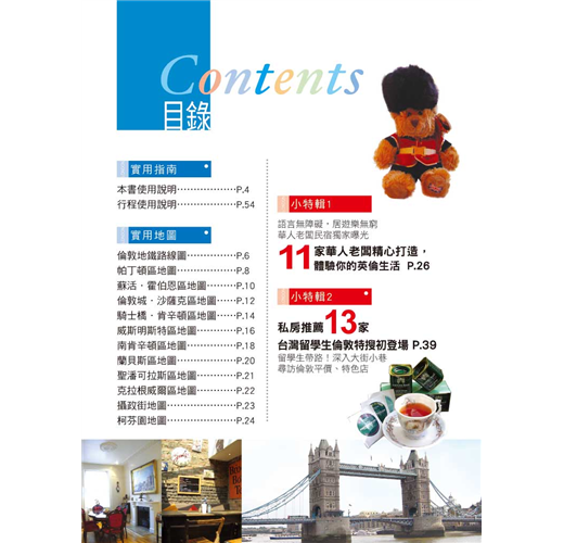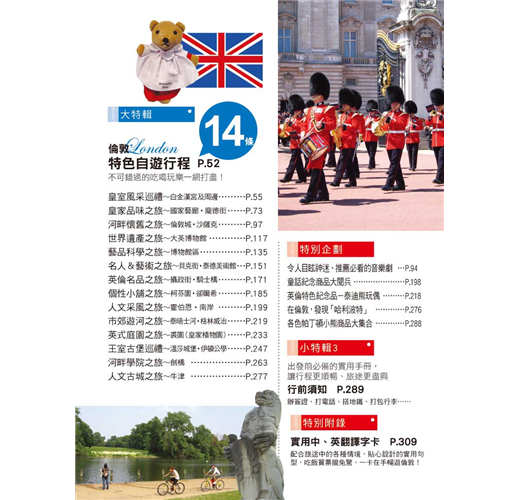 第一本國人自製海外旅遊情報誌,以台灣自助旅行者的需求為出發點,完整規劃出每日旅遊行程、交通路線與預算費用,並針對各種可能遇上的狀況提出貼心建議。特別企劃的博物館紙上導覽、在地留學生推薦美食餐廳,以及華人民宿獨家介紹,用第一手資料提供最新、最全面的玩樂資訊!詳細的倫敦市區地圖、實用的行前須知,以及針對旅遊情境設計的中英翻譯字卡,只要一步步按圖索驥,就能輕鬆自在暢遊倫敦。