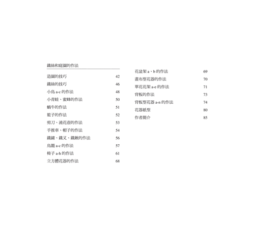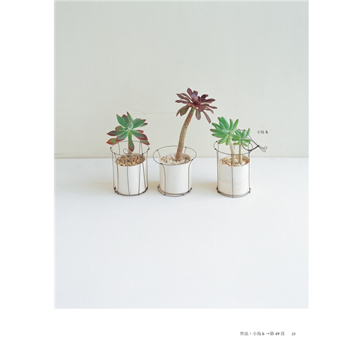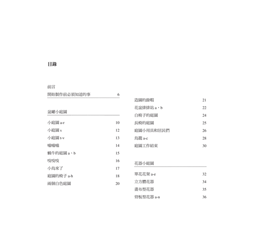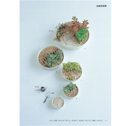 準備小庭園的花器也不麻煩,舉凡用過的空罐、盤子、瓶子等等,都可以拿來用。鐵絲小物雖然迷你,但是卻可以襯托出小庭園的景致,展現不同的氛圍。44款鐵絲小物包含可愛的青蛙、小鳥、蝸牛等小動物,還有特別能營造氣氛的鳥籠、椅子及園藝工具,還有可以凸顯簡單花器的設計感的各式花架。