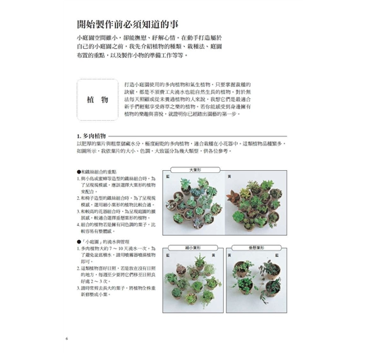 小庭園採用不需特別照顧的33款多肉植物和氣生植物,都是不須費工夫澆水也能生長得好的植物,對於從未養過植物或忙碌的人來說,只要掌握裁種的訣竅,它們絕對是最適合新手們輕鬆享受蒔草之樂的植物。