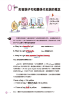本書的解說部份貫徹了由淺入深的理念,分成了概念、用法及延伸學習三大類。在進入每個新的文法觀念時,「概念」部份可以為上面的圖解和重點提供詳盡的補充說明;接著就是「用法」部份,透過文字把每個文法項目的用法重點勾劃出來;而「延伸學習」則為文法項目提供了額外的資訊,如對學習者的重要提醒等。例如: